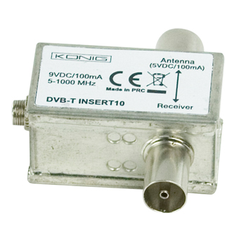 Professionele power inserter met metalen behuizing en gestabiliseerde uitgangsspanning. Geschikt als voeding voor de actieve DVB-T antennes voor Digitenne van KPN en andere digitale signalen. • Demping: 1.5 dB • Uitgang: 5 V DC / 100 mA • Adapter: 220 V AC/ 9 V DC 100 mA (afneembaar)